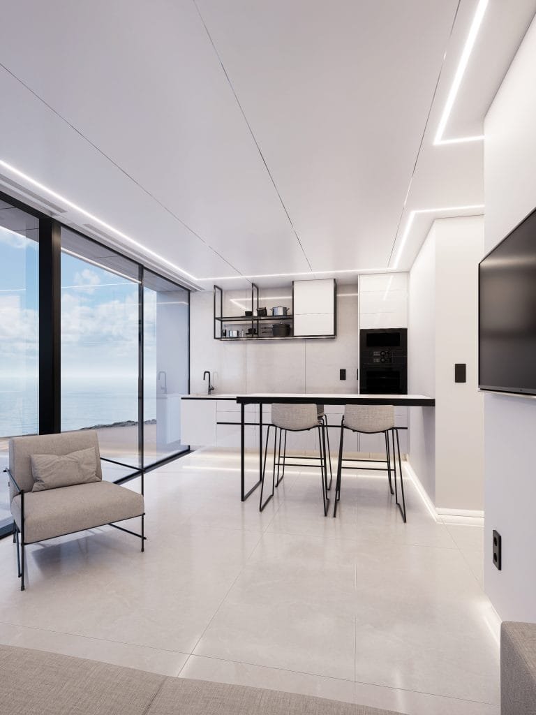 Architectural kitchen with open-plan layout, central island, and high-spec finishes, including Italian porcelain countertops and Roca faucets.