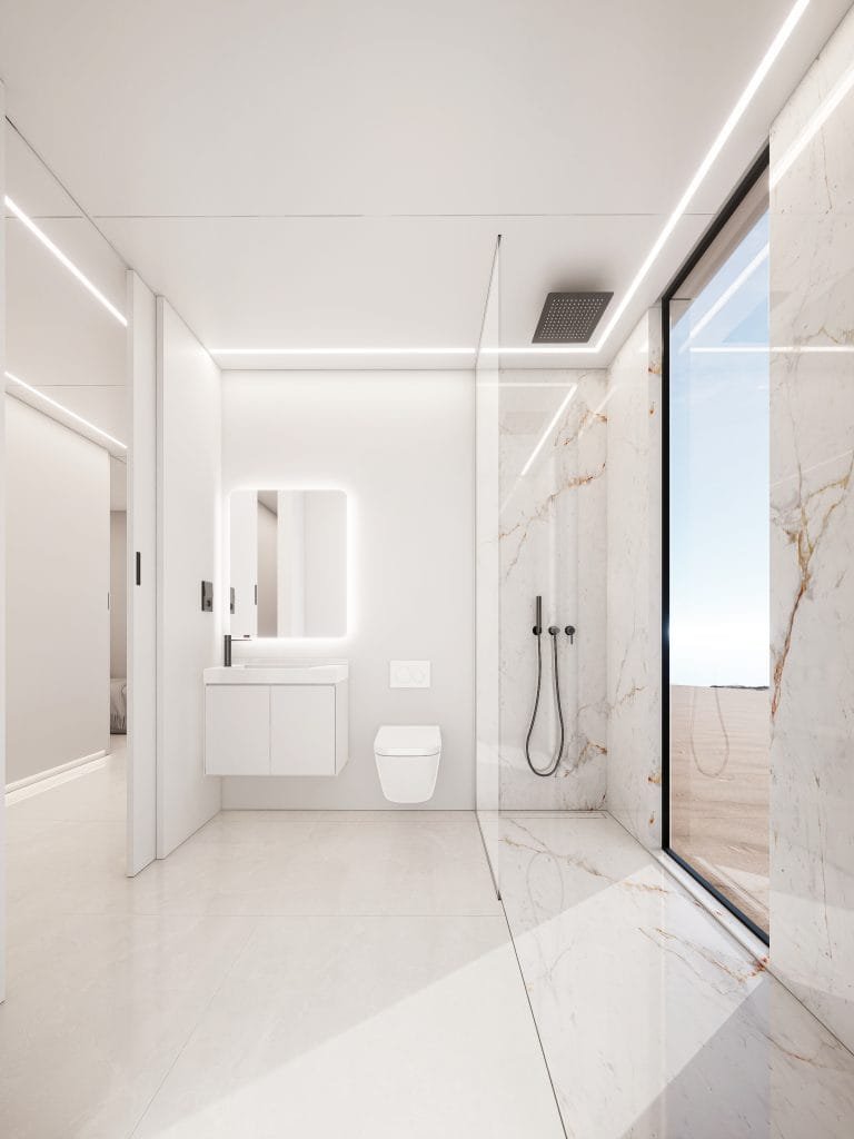 Luxurious bathroom featuring large-format Italian porcelain shower cladding, integrated sink, built-in Roca faucets, wall-hung toilet, and a custom-made floor-to-ceiling glass shower screen.